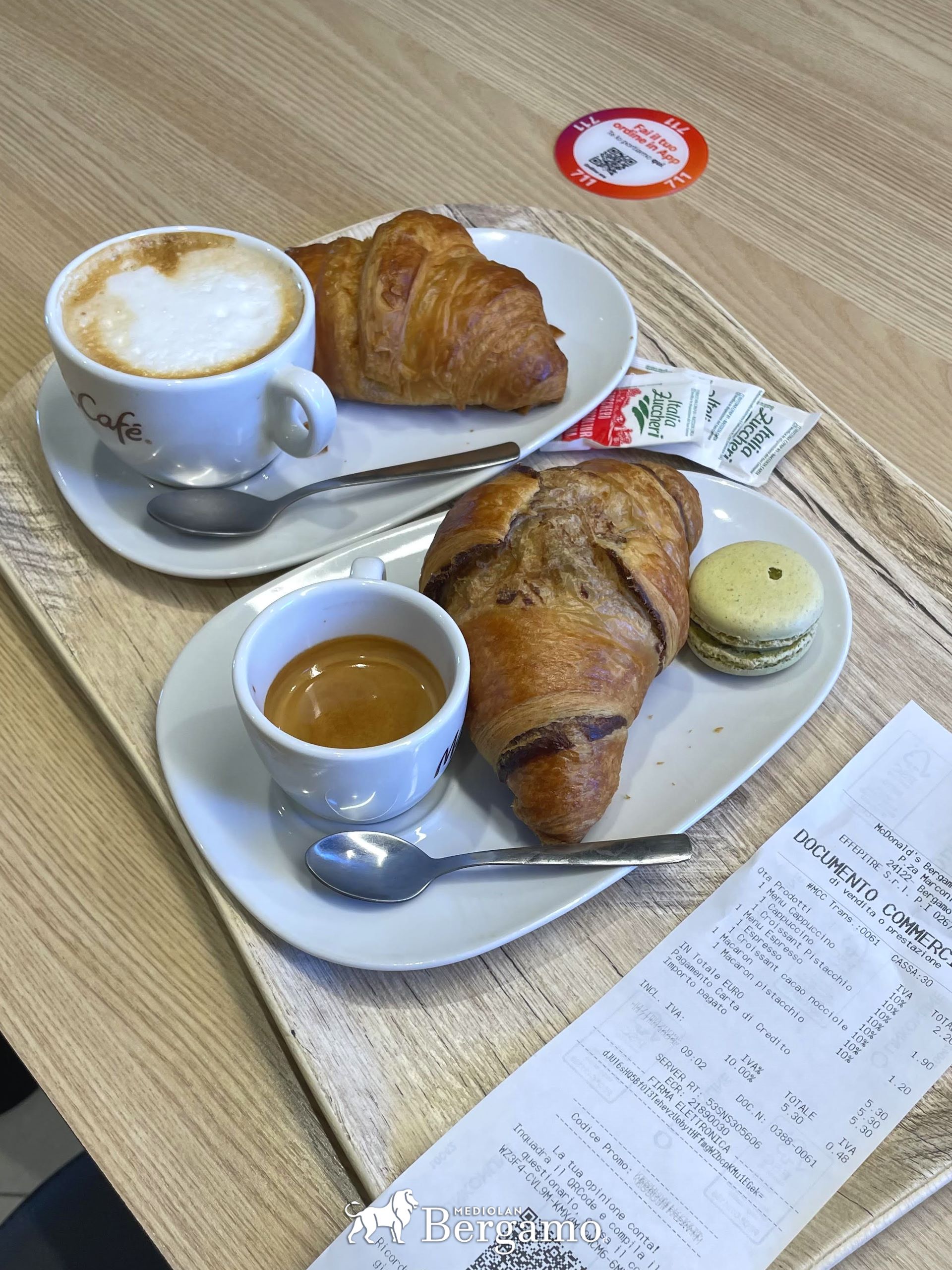 Typowe włoskie śniadanie w McDonald’s w Bergamo. Cappuccino, croissant pistacjowy, espresso, croissant czekoladowy, makaronik z pistacjami za 5,30 EUR.