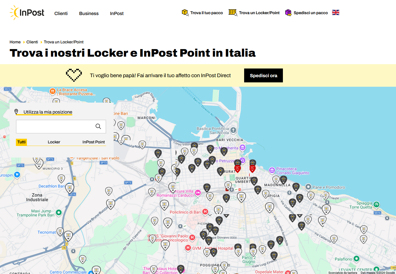 Bari jest już w pełni objęte siecią InPost. Znajdziemy tu zarówno Paczkomaty® (znane we Włoszech jako Locker) jak i punkty z których wysyłać można przesyłki, znane we Włoszech jako InPost Point.