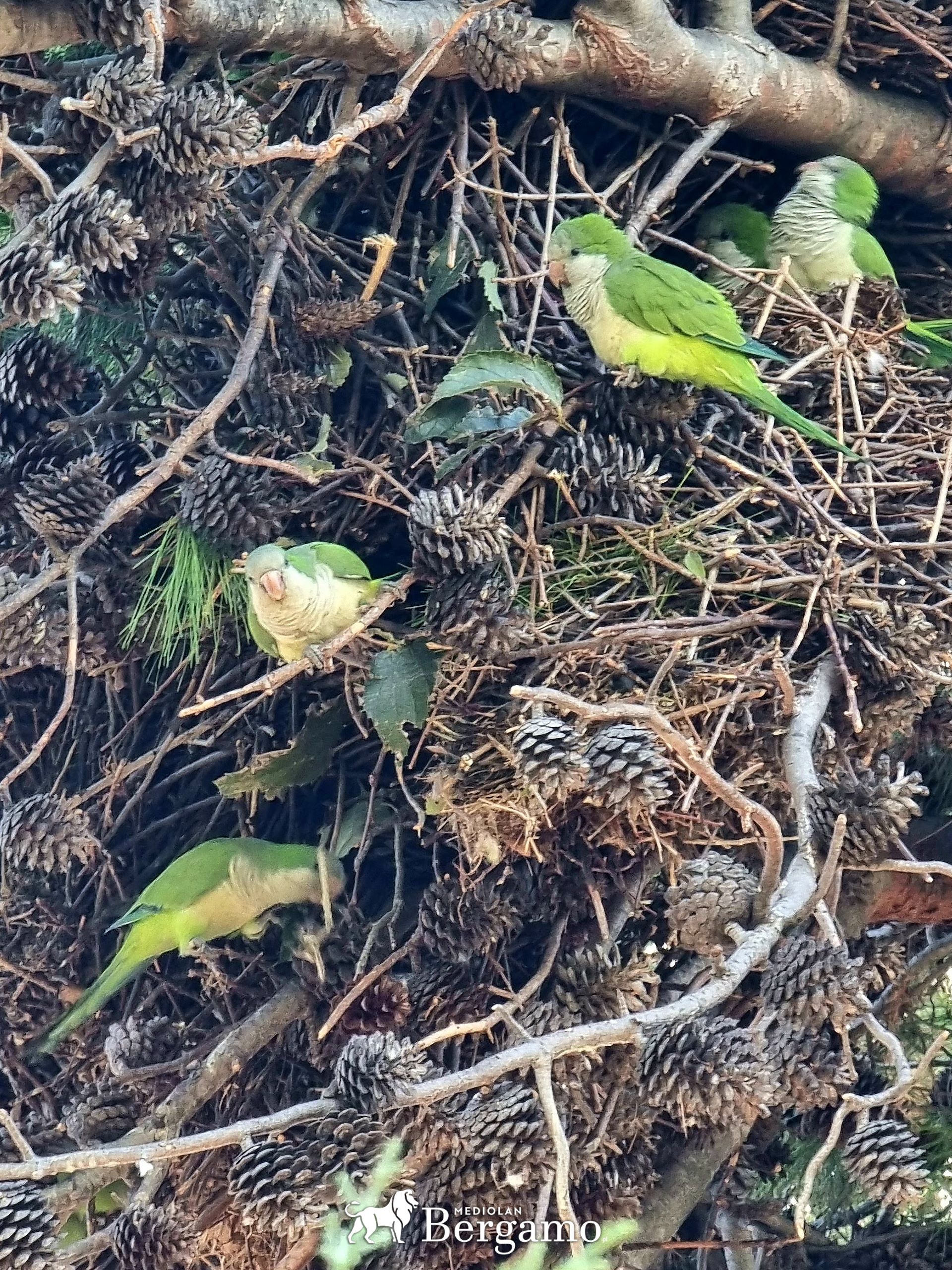 Na filmie powyżej (przewińcie do połowy) zobaczyć można stado papug przepędzające ptaki z karmnika. Papugi we Włoszech osiedliły się w co najmniej 12 regionach i 30 miastach, z koloniami na przykład w parkach miejskich (np. ogrody przy Villa Reale w Monzie, Appia Antica w Rzymie, Castello Visconteo w Pawii czy Parco Sempione w Mediolanie).