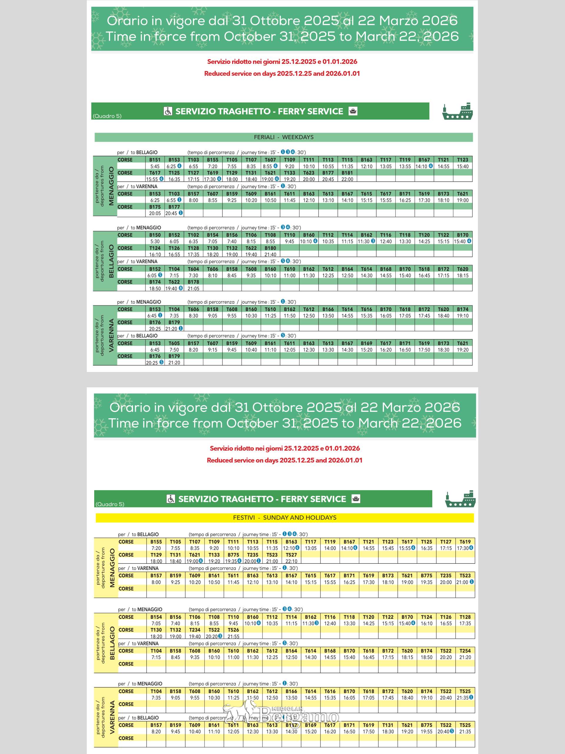 Jak widzicie, nadal bez problemu będziecie mogli podróżować i rejsować po środku jeziora pomiędzy Bellagio, Varenną i Menaggio oraz z Como do Colico z przzystankiem w Bellagio. Szkoda nam tylko promów z Lecco. Nowy rozkład promów trwa od początku listopada 2025 roku do 22 marca 2026 roku.