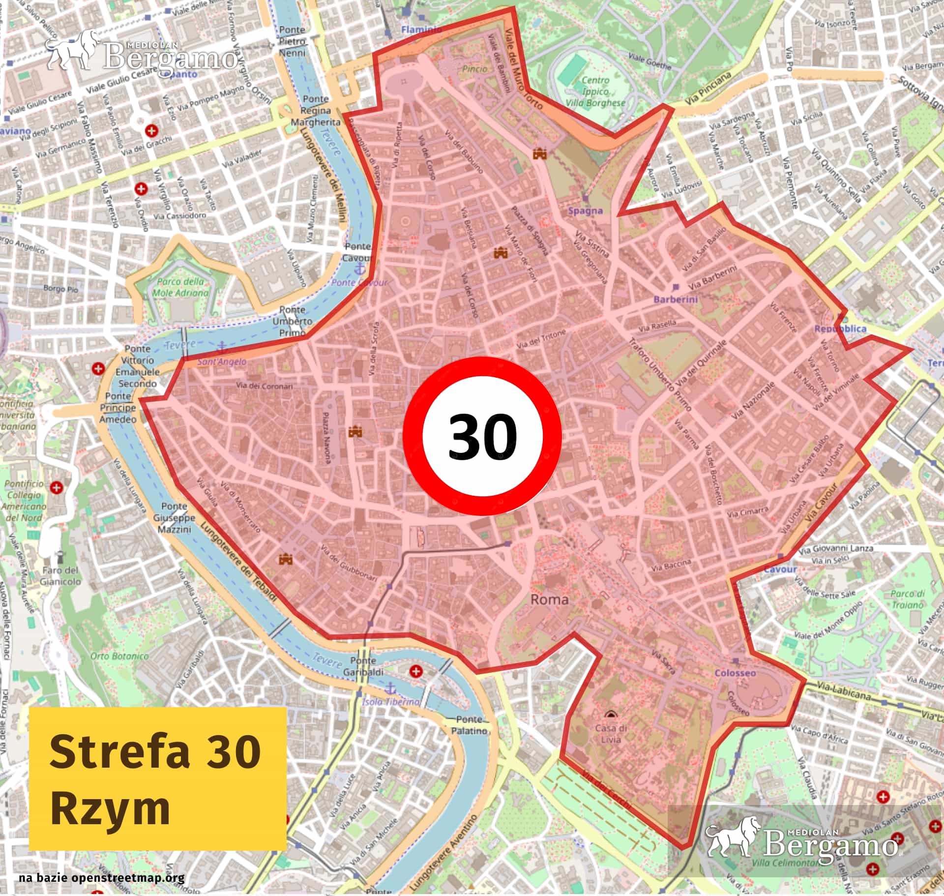 Dotychczas ograniczeniem do 30 km/h objętych było około 49% ulic w strefie Centro Storico. Teraz nowym limitem objęto nawet główne arterie centrum. To obszar o powierzchni kilkudziesięciu kilometrów kwadratowych w którym codziennie poruszają się tysiące pojazdów.