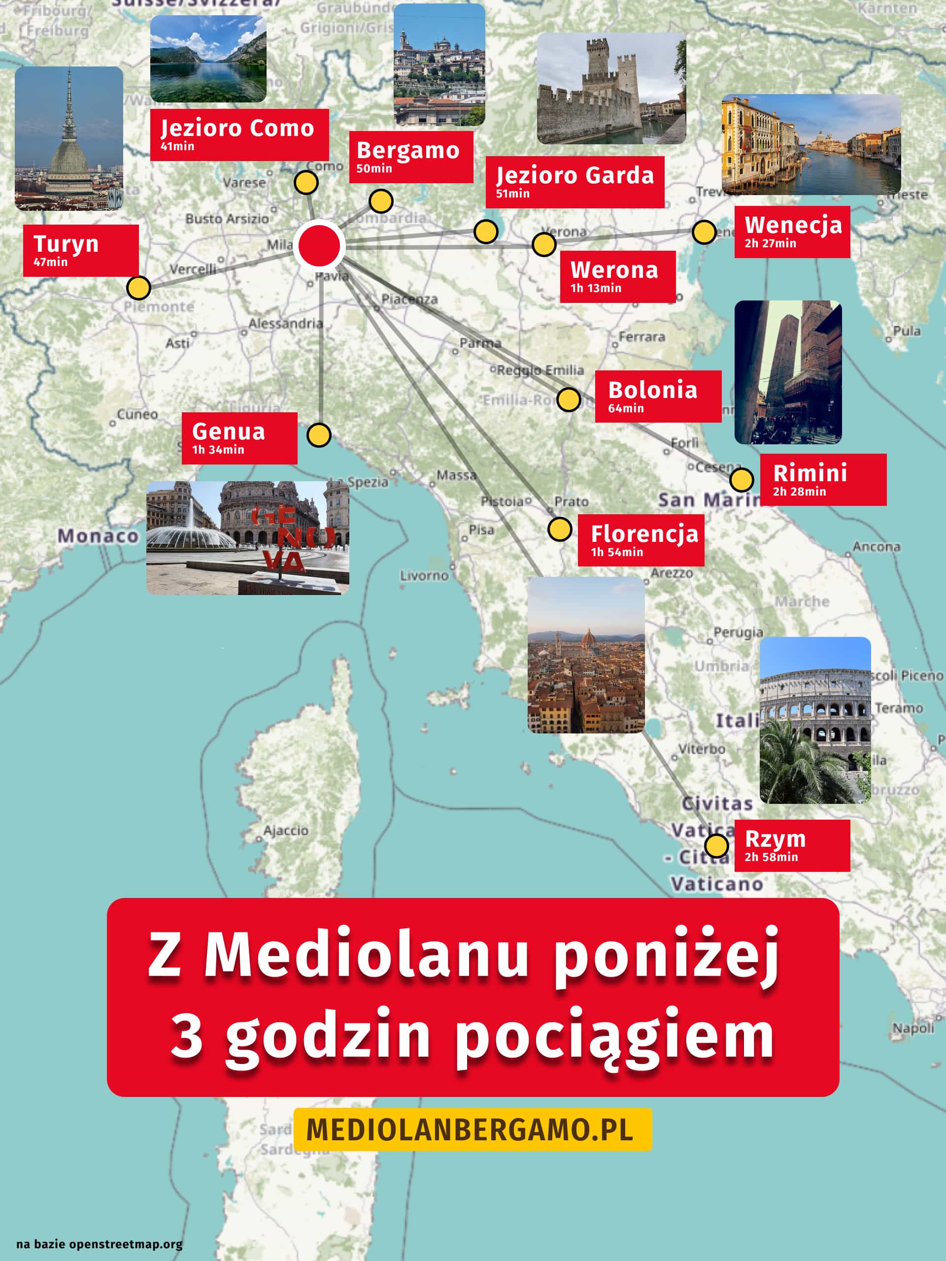 Dzięki doskonałej sieci szybkich pociągów Frecciarossa i Italo Mediolan jest idealnym punktem startowym na krótkie, weekendowe lub jednodniowe wyjazdy do najróżniejszych zakątków kraju. W kilka godzin jazdy da się dotrzeć do jednych z najciekawszych miejsc we Włoszech. Warto tylko pamiętać o tym, że we Włoszech mogą strajkować przewoźnicy kolejowi. Tu podpowiadamy jak dowiedzieć się czy jest strajk we Włoszech.