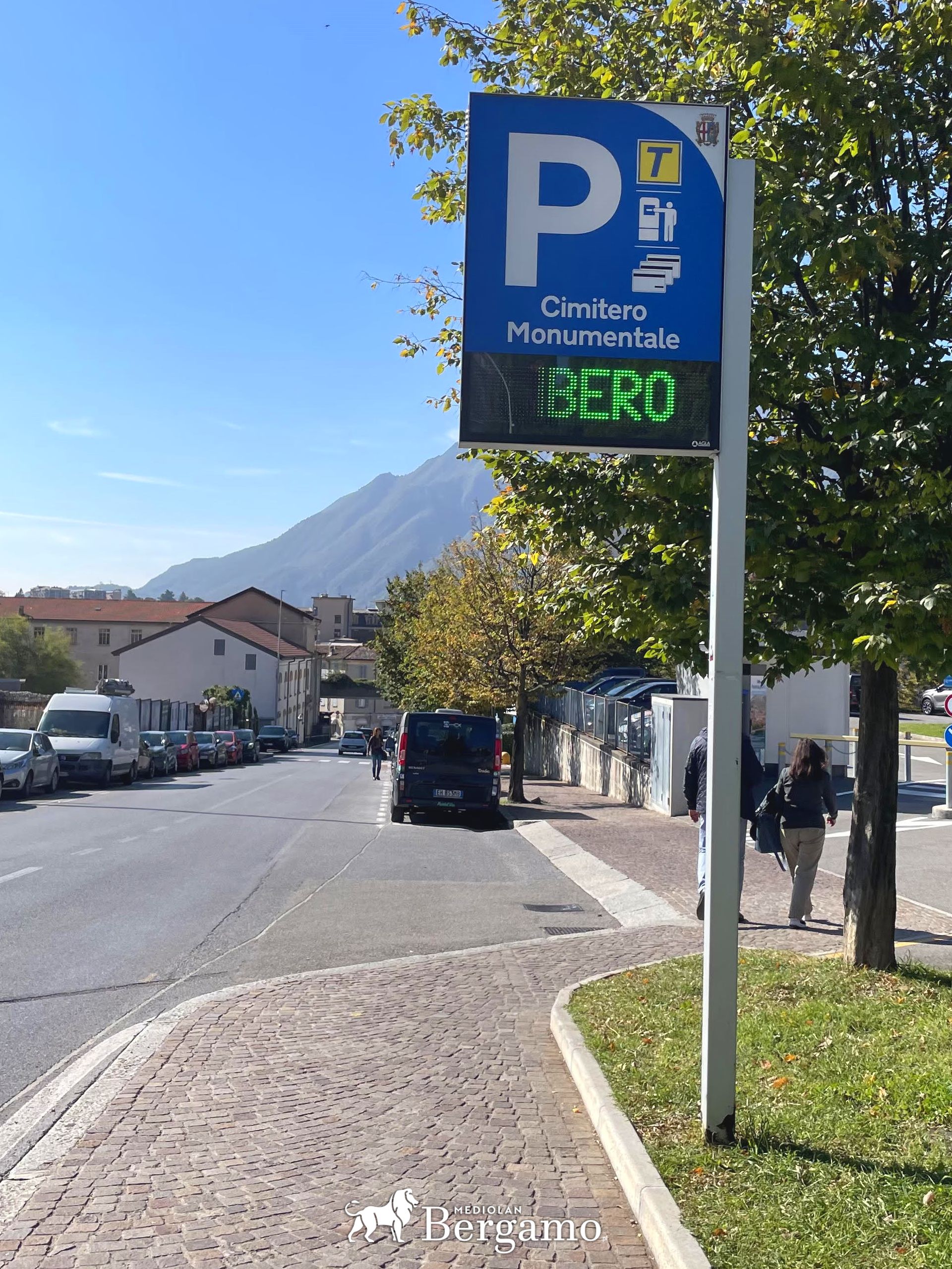 Płatny parking przy Cmentarzu Monumentalnym w Lecco. W tej okolicy znajdziemy też darmowe miejsca parkingowe