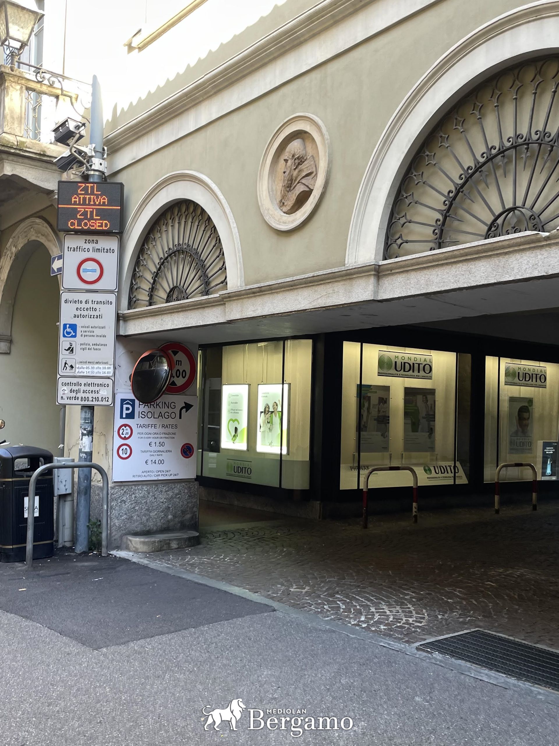 Wjazd na kryty parking Isollago w Lecco przy via Fratelli Cairoli. Obok wjazd do strefy ZTL
