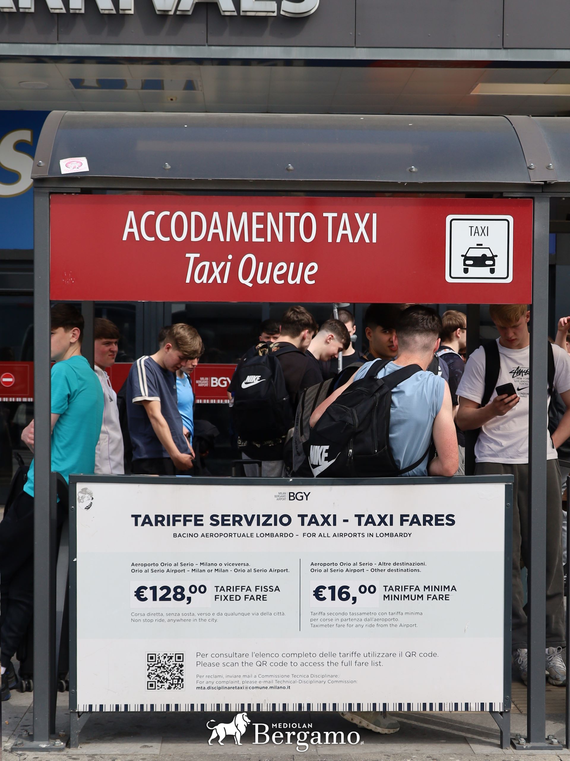 Przypominamy, że we Włoszech wszystkie legalne taksówki to białe pojazdy wyposażone w taksometr. Stawka dojazdu do Mediolanu jest wyraźnie zasygnalizowana na stosownych tablicach na lotnisku w Bergamo.