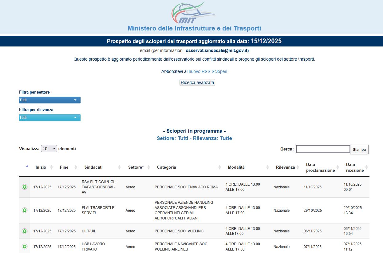 Ministerstwo infrastruktury prowadzi specjalną stronę internetową (tu) na której znajdują się daty i konkretne szczegóły każdego ze złożonych strajków w postaci nazw związków zawodowych zgłaszających strajk, regionu i branży w której się odbędzie, listy pracowników spółek objętych strajkiem, aż w końcu daty i godziny strajku. Strona jest dobrze znana i zawsze aktualna lecz prowadzona jest w języku włoskim.