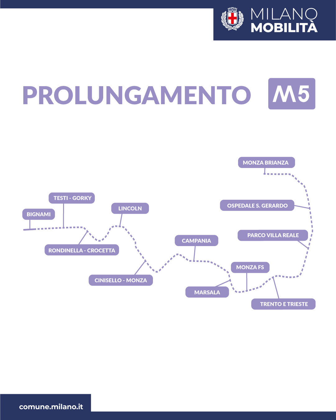 Rada gminy Mediolan zatwierdziła wytyczne dotyczące podpisania nowej umowy między Ministerstwem Infrastruktury i Transportu, Regionem Lombardii a Miastem Mediolan, mającej na celu sfinansowanie i budowę przedłużenia linii M5 do Monzy. Jednocześnie zatwierdzono ostateczny projekt – czytamy w kanałach social media gminy Mediolan