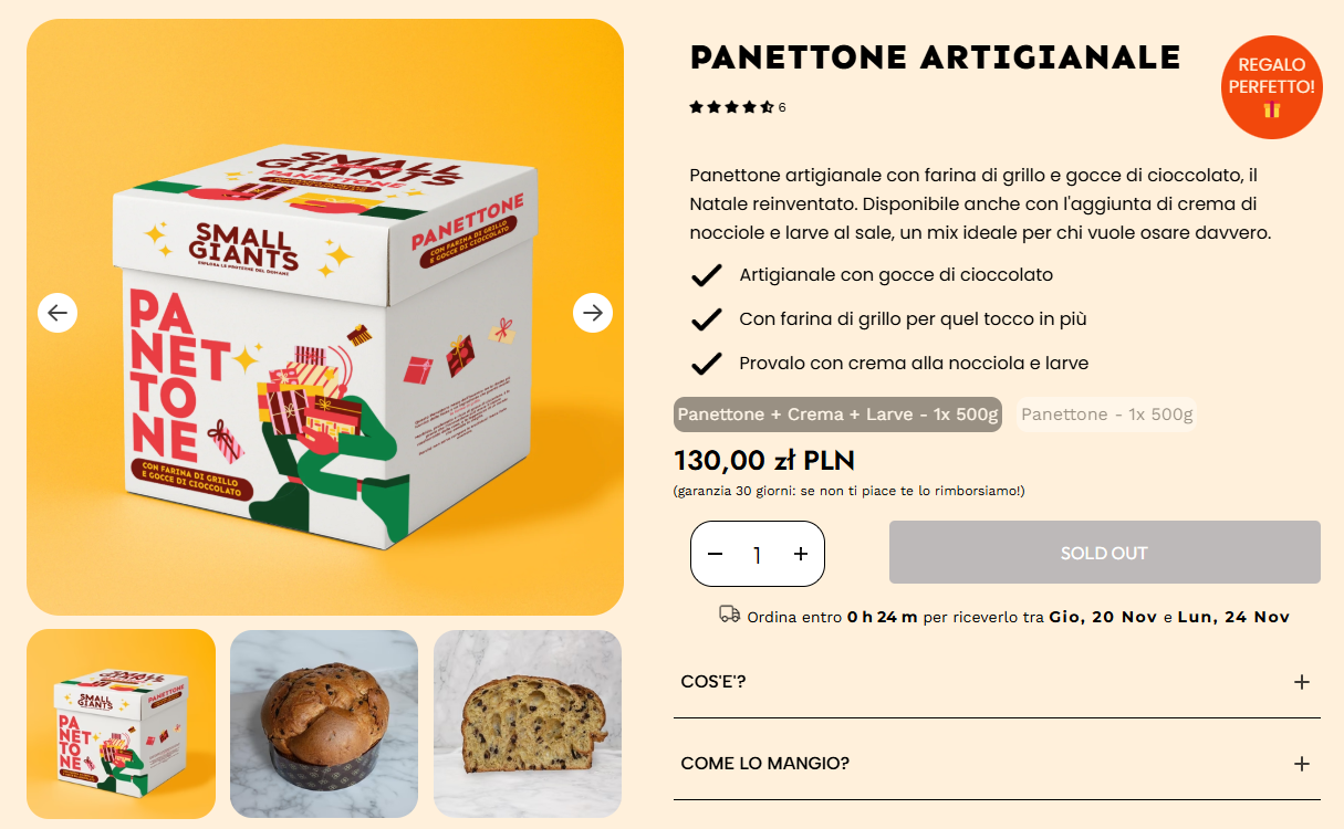 Za produkcję włoskiego Panettone z mąki świerszczowej z dodatkiem larw odpowiada firma Small Giants. Producent na swojej stronie internetowej podkreśla, że tego typu Panettone jest we Włoszech oferowane po raz pierwszy. Tak Small Giants zachwala swój nowy świąteczny produkt: