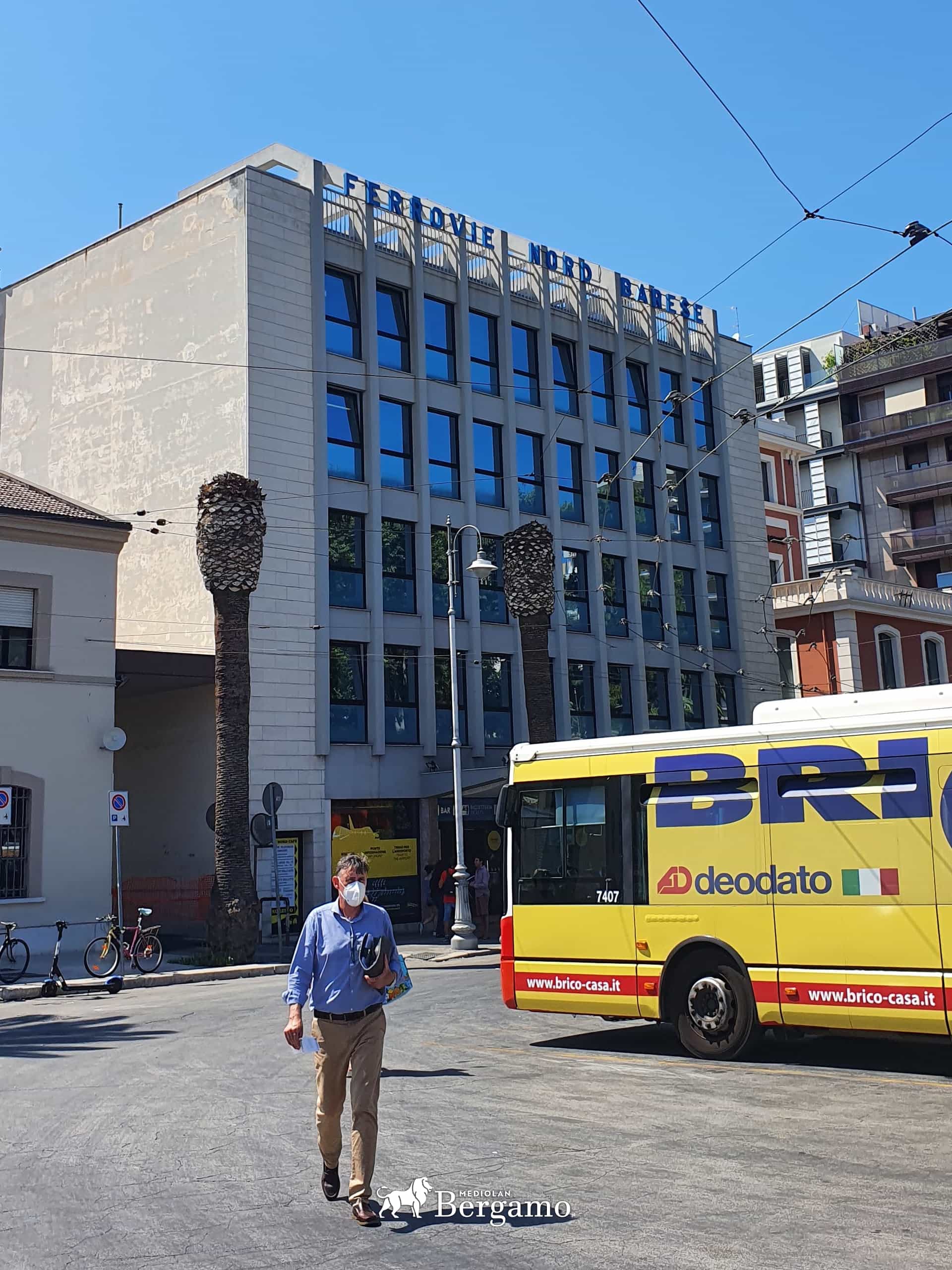 - Kolejny na prawo, schowany przy ulicy Corso Italia (na rogu Piazza Aldo Moro) znajduje się dworzec Ferrovie Appulo Lucane – gdzie odjazdy mają pociągi do Matery czy Altamury. Na zdjęciu powyżej poznacie go po pomarańczowej elewacji, schowany jest za autobusem.