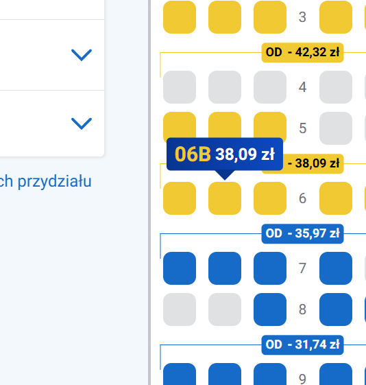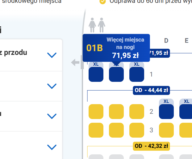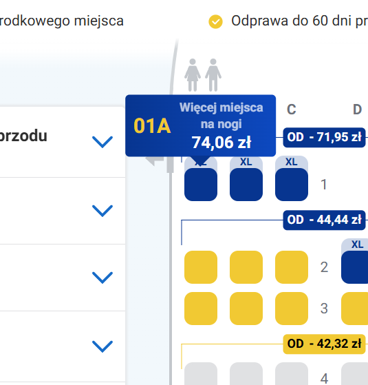 Za miejsce w pierwszym rzędzie przy oknie 01A trzeba w tym wypadku zapłacić 74,06 PLN w przypadku miejsca w środku 01B 71,95 PLN. W rzędzie 6, miejsce A kosztowało nas 40,20 PLN, miejsce B 38,09 PLN. Różnica nie wydaje się duża, ale wbrew pozorom może mocno doładować portfel Ryanaira w 2026 roku.