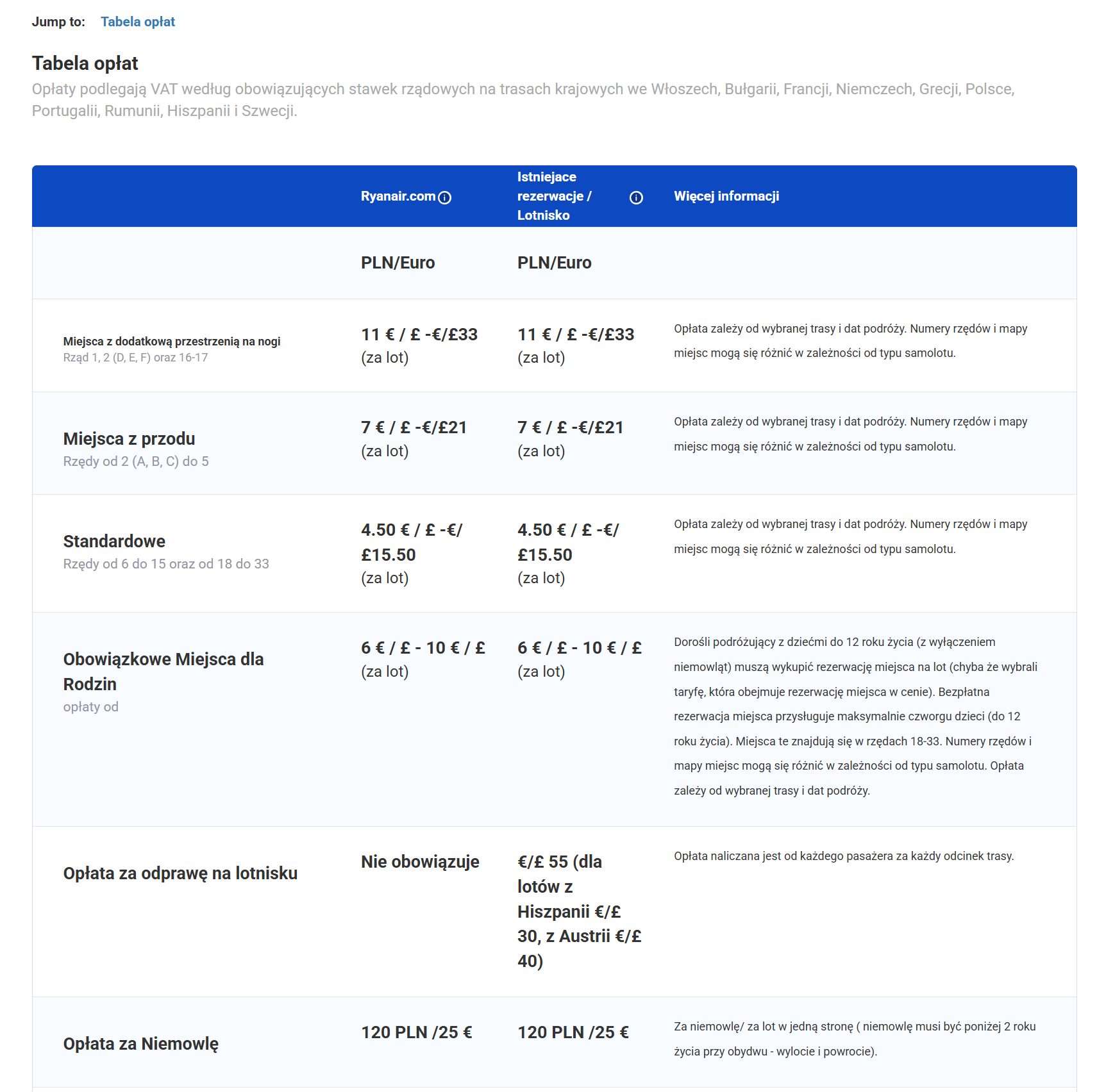 Poniżej znajdziecie aktualne ceny (zakresy) miejsc ze strony Ryanair.com