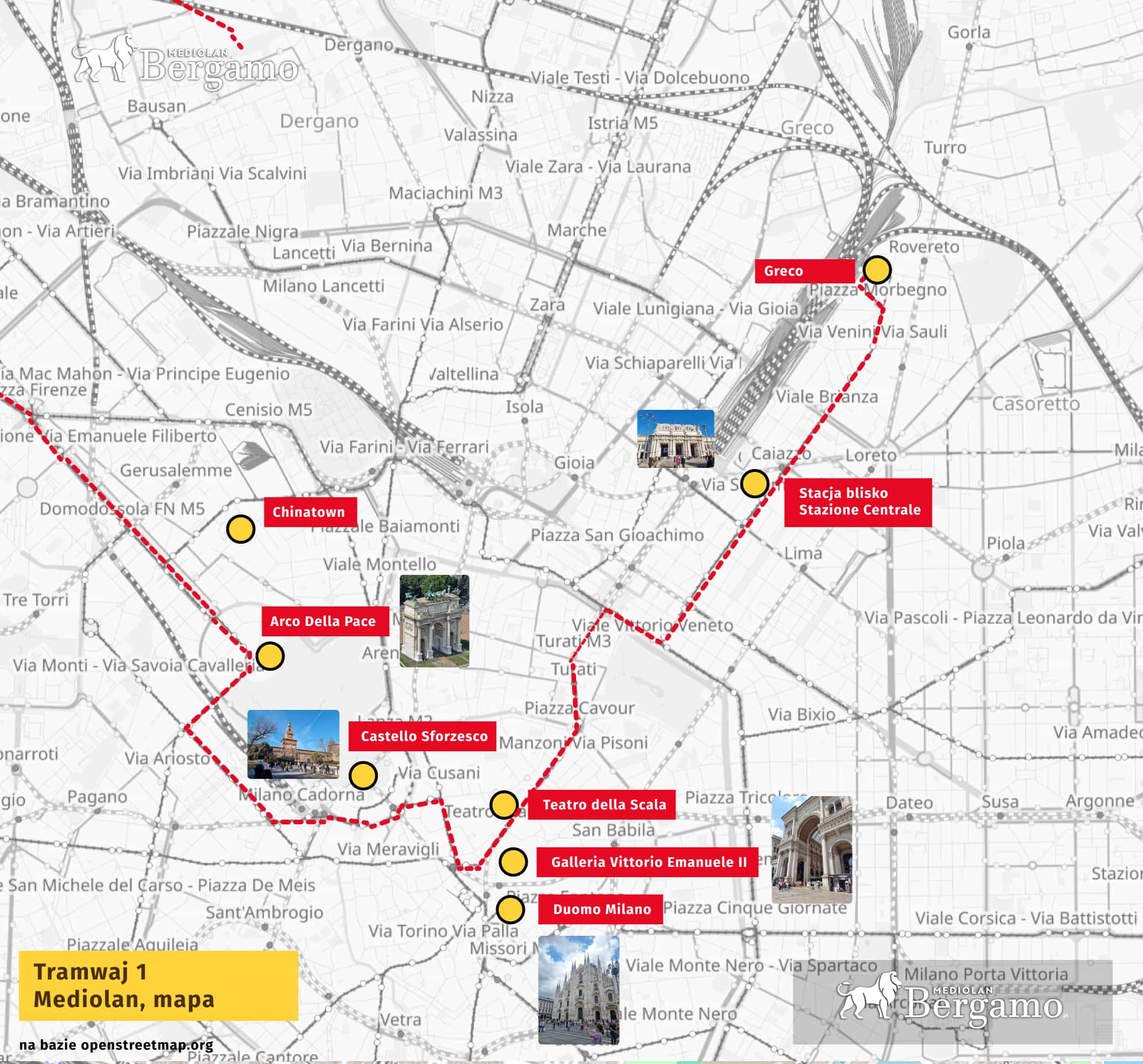 Jadąc jedynką możemy wysiąść w dzielnicy Brera i Quadrilatero della Moda. Oczywiście najbardziej interesującym turystów fragmentem jest przejazd od Piazza della Repubblica do Arco della Pace i właśnie tym fragmentem najbardziej polecamy się przejechać.